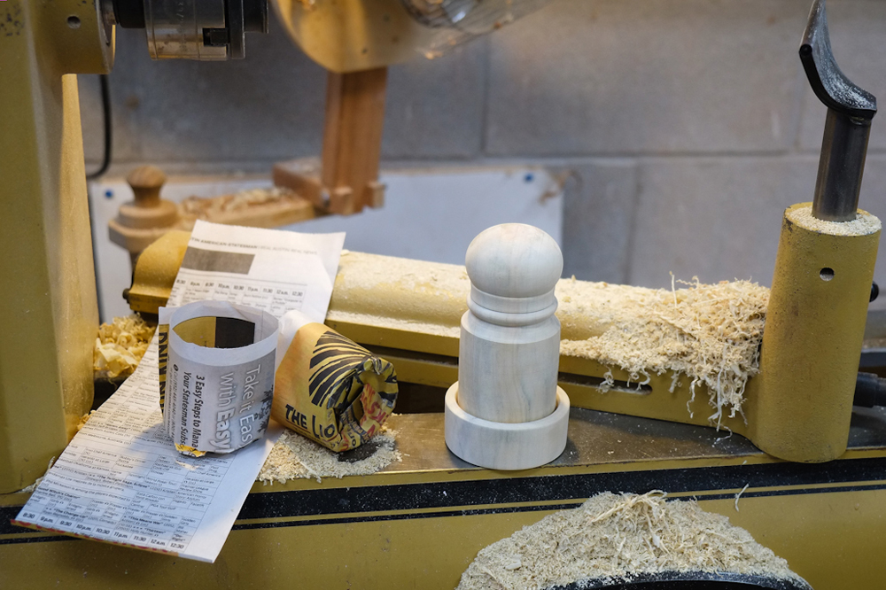 I started by turning the piece down to round and marked my layout lines. Then, I started shaping the top of the maker. You have an opportunity to add a few beads, coves, or any embellishment shape you prefer. However, since the top will be pressed down into the base by hand, you should make the top comfortable. A round over top is ideal.