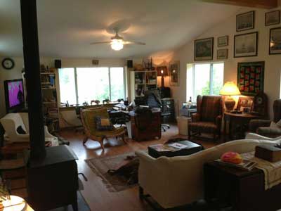 The upstairs loft/office includes a full bathroom, two small bedrooms, and a large living area/office – also heated with an airtight woodstove -- with a kitchenette where my other sons with their families and friends can stay for prolonged visits. Mainly this serves as my office area and private collection gallery.