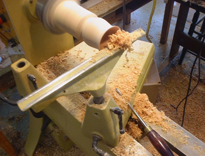 Shape, smooth, and sand the outside of the goblet cup with particular attention to the cup lip. Do not shape to final stem size; rather, leave at least 2/3 of the cylinder diameter to support the hollowing stress. Remove the tailstock.