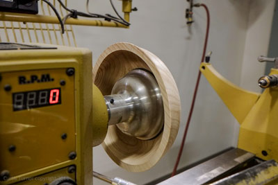 The piece can be removed from the drum chuck by switching off the vacuum pump. A word of caution: you must hold the completed piece prior to turning off the vacuum. The piece will fall onto the lathe once the seal is broken.