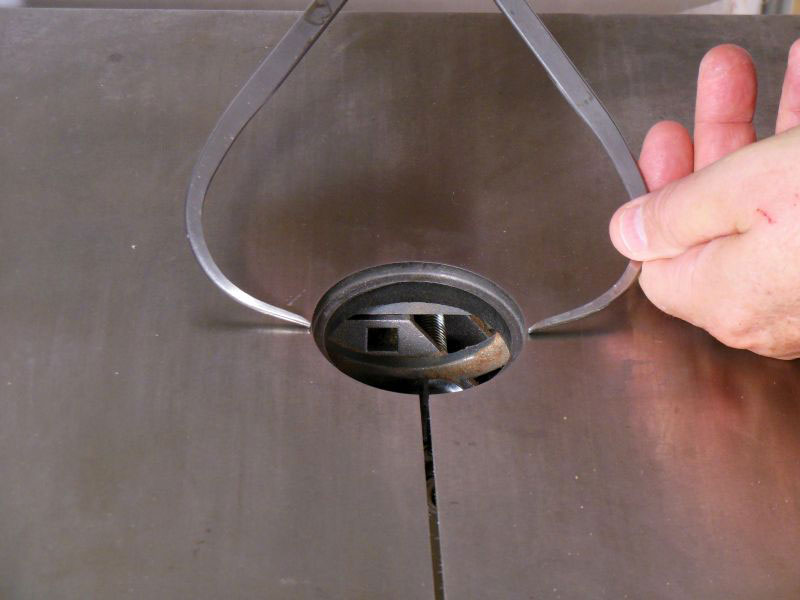 Back to the bandsaw….the insert won't drop fully into place now. Use a mallet (or your fist, but beware of the blade teeth) and tap the insert down flush with the surface (Figure #50).