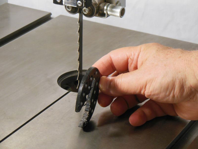Recently, in a move designed to strike terror into the heart of any sane woodworker, I attempted to crosscut a 3" diameter cylinder on my bandsaw, WITHOUT holding it securely in any kind of clamp. Although I still have all my fingers, the bandsaw blade emerged from the incident severely bent out of shape, and the bandsaw table insert, that little plastic round thing in the bandsaw table that surrounds the blade, was missing chunks of its self-image (see Figure #1).