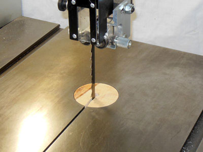 Back at the bandsaw, set a pair of calipers to the diameter of the larger (topmost) opening in the bandsaw table (Figure #10).