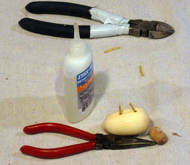 The control gondola hangs below the lift envelope with, in my case, some massive brass struts. I used two 4-inch pieces of 16 gauge brass-colored craft wire to make the struts. I cut the 2 pieces to length, affixed both in the chuck of an electric drill, clamped the other end of the wires in a vise, and ran the drill to twist the two pieces tightly together. It worked great!