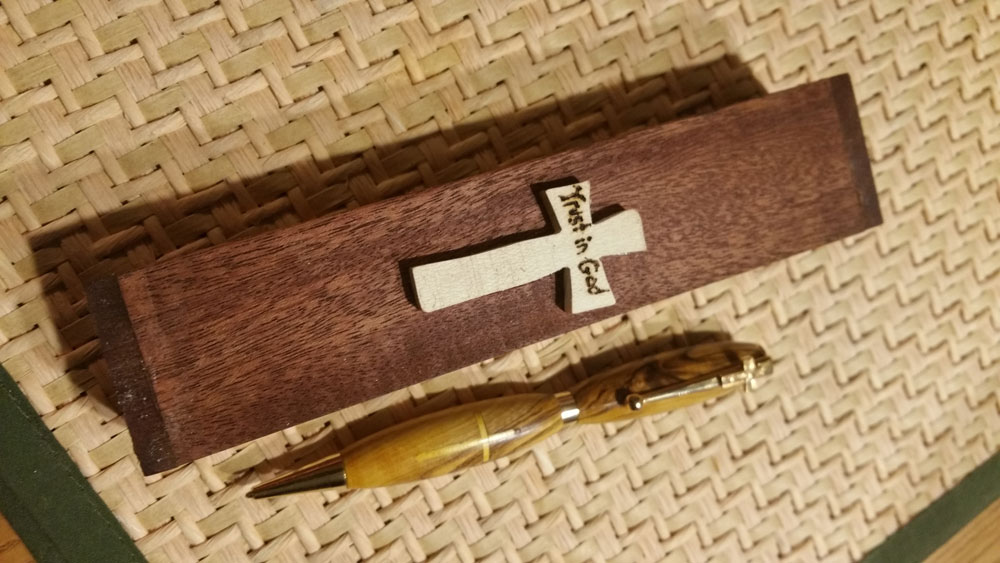 cross on the top of the box was made from a piece of Holly veneer. I used a scroll saw to cut