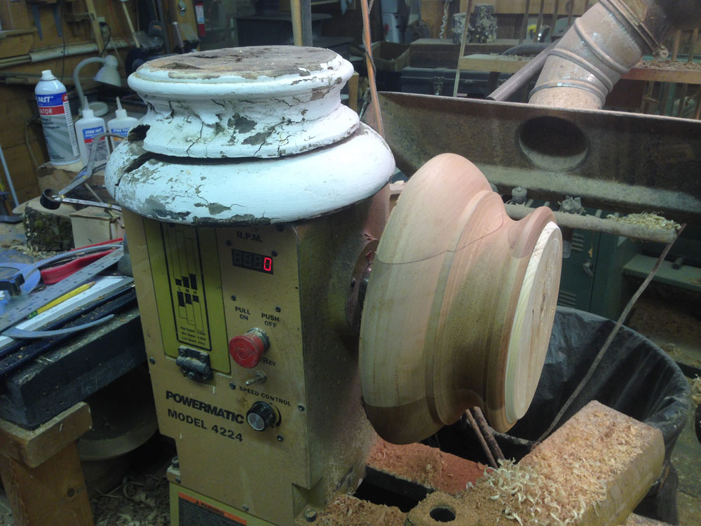 With the actual turning complete from the bowl gouge followed by the straight-across and round-nose scrapers, the finished base is ready for final sanding. Notice the important dimension of the upper shoulder on which the new PVC columns will sit.