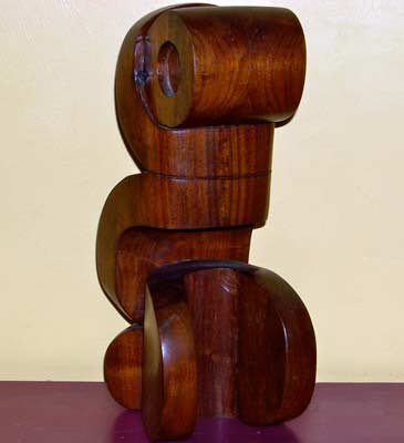 Pictured below and at the beginning of this article are a few Bas relief works done mostly in H. Mahogany. My work has been influenced by the Surrealists. Works here range in size from 20" x 20" for Grandmother and Grandfather clocks, to 28' x 42" x 2" for "social science research."