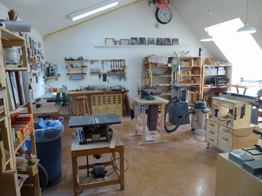 I had the building framed by a local contractor and then I proceded to do all of the interior work, myself, including wiring, insulation, vapour barrior, drywall and trim. Making world class instruments requires, amoung other things, a climate controlled environment for assembly and storage of wood. With a very tightly sealed vapour barrior and a commercial grade dehumidifier I am able to keep the humidity at a constant 40%RH through the most humid of days. In the heating months, a little humidifiction is needed.
