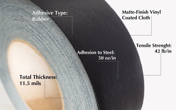 Somewhere along the history of film making, gaffers helped create "gaffer's tape." A very special tape, it needed certain qualities. First, it needed to be black and not shiny, so as to not show on stage floors or cast unwanted reflections. Second, the special "gaffer's tape" needed to stick well, but also be able to be removed easily without harming the underlying surface. Third, gaffers wanted a tape that could be torn easily by hand, since they always need to work fast and efficiently, and fourth, the tape needed to be heat resistant, especially in the old days when studio and stage lights were hot, hot, hot.