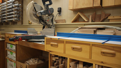 Ask yourself this simple question: In your shop, would you feel safer, make more accurate cuts, and overall enjoy cutting a long piece of wood at your miter saw if it was on a stand like mine (see Figure 6 below), or would you rather have your miter saw on a small stand and the wood supported on either end with a pair of free-standing roller stands?