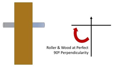 The roller must be at a perfect 90-degrees (perpendicular) to the direction of wood travel, or the roller will tend to "pull" or "push" the work piece in a direction you do not want it to go (see Figures 7 and 8 below). This is the potentially dangerous part when you are using a roller stand to support a large piece of wood at the table saw or band saw, and at the very least, leads to inaccuracies when cutting.