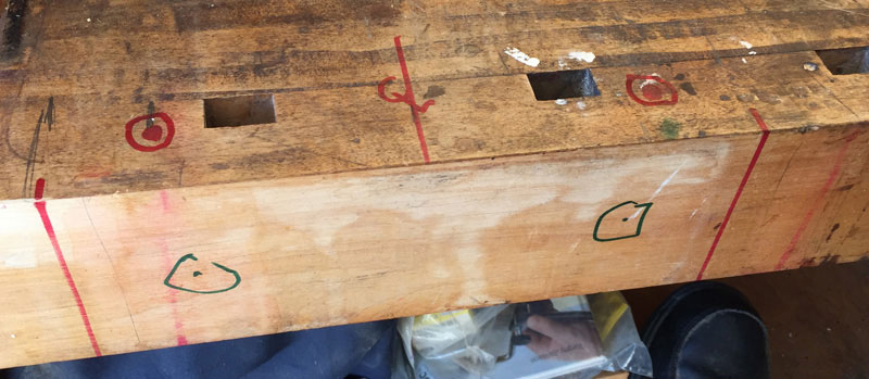 Then it was time to use actual vise measurements to locate the vise so that the front set of mounting lag screws missed the existing dog holes. Those locations are shown by the red dots on top. The green dots on the skirt face are to be where shallow mortises will provide clearance for the screws that hold the rear liner on. I have chosen to not mortise the rear jaw in the bench after consulting with Highland Woodworking Technical Support. Kudos to them for the same day response to my emailed question.