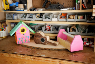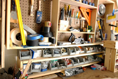 displayed for easy access. I placed all my screws, nails, and drill bits in small plastic bins for easy access.