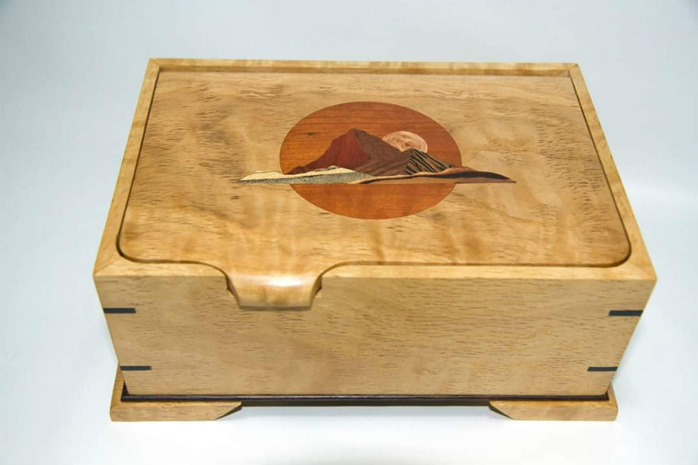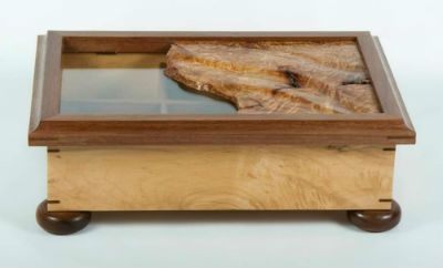 Watch case - made in maple and mahogany, with a sculpted oak burl top designed to mimic the waves of our Gulf coast.