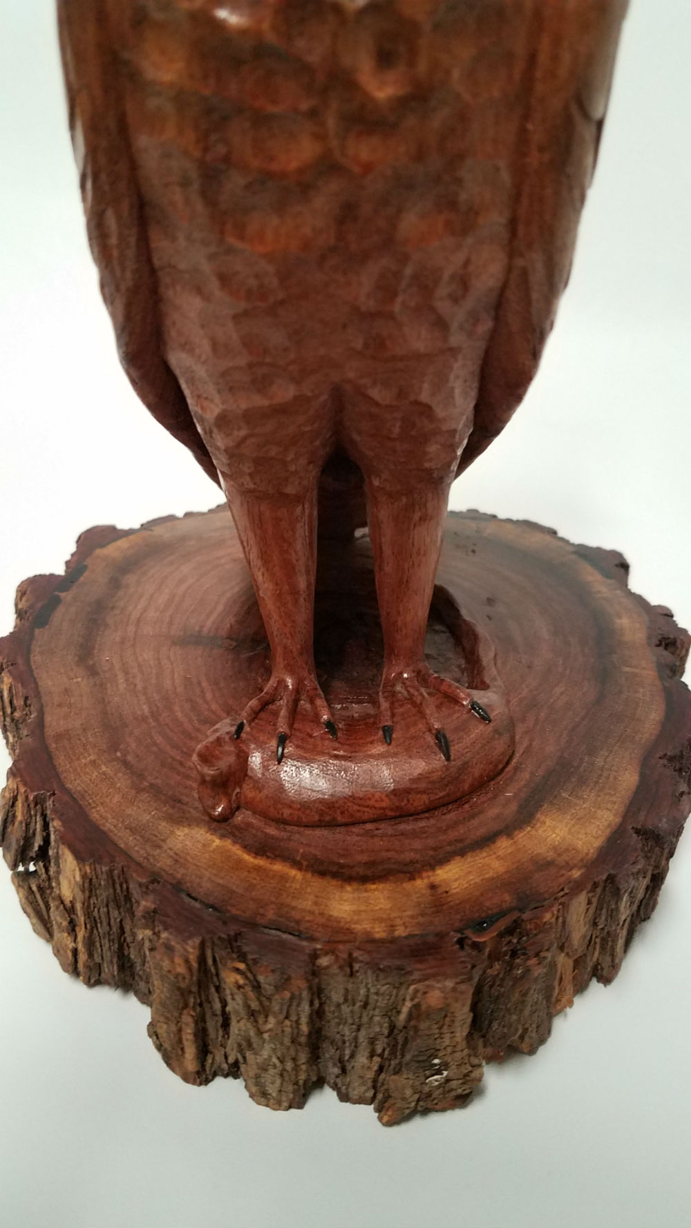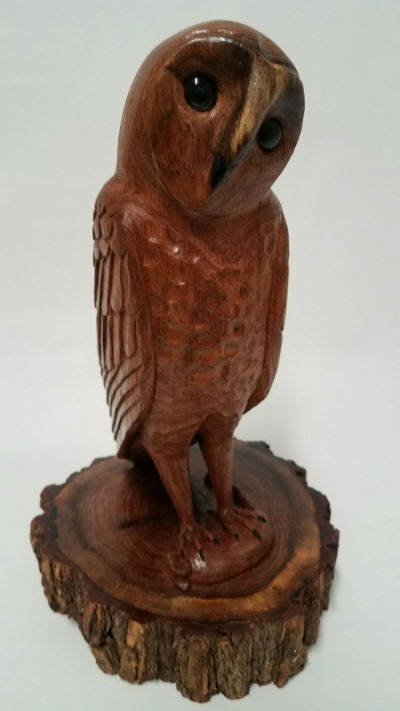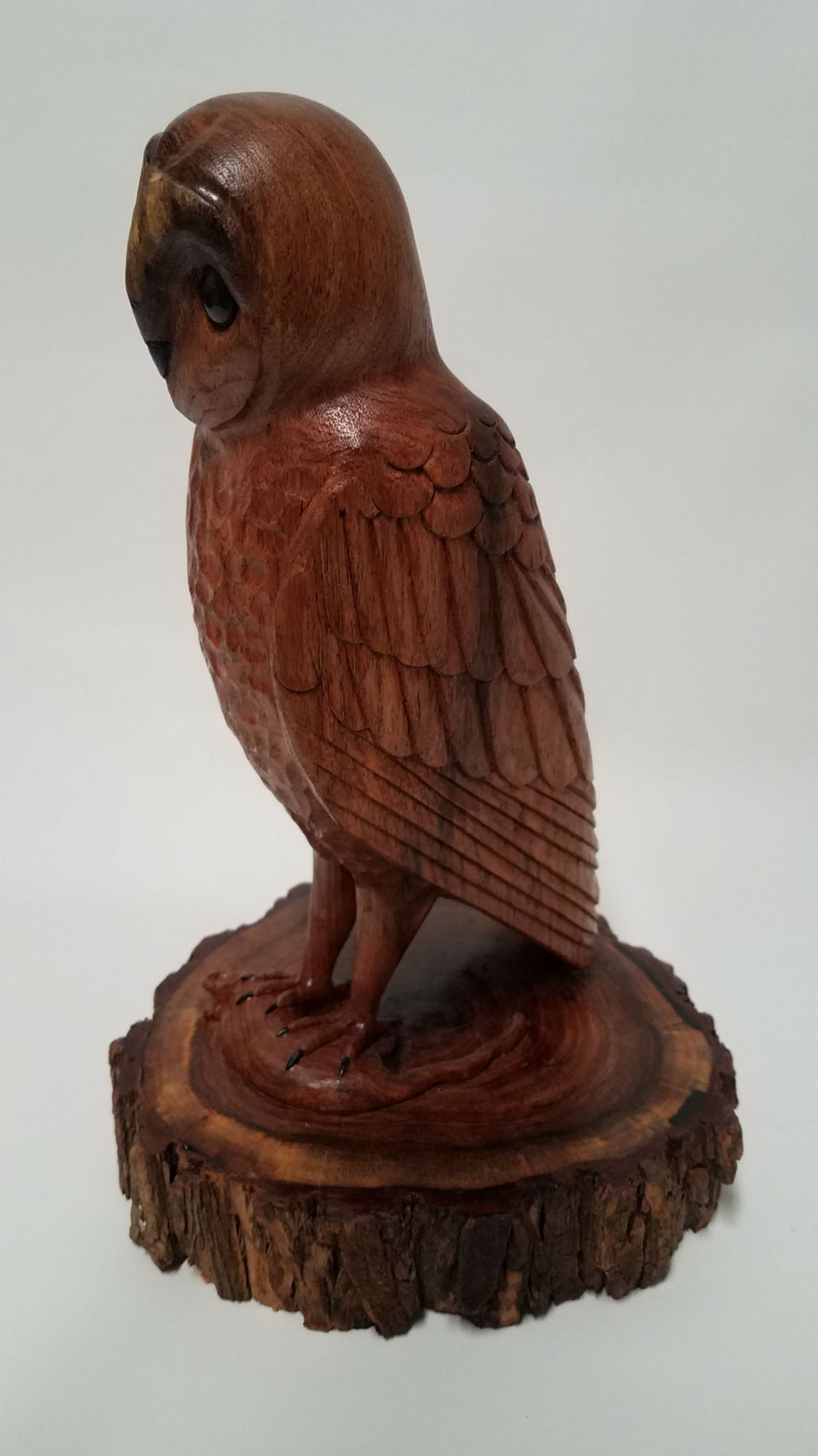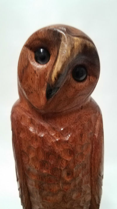 My latest stylized barn owl is carved from one piece of black walnut with the exception of the carved African Blackwood talons that were applied. The carving is about 10" tall.