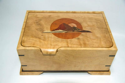 "Moonscape" made in curly oak with wenge accents. Various woods for the inlay and dyed leather.