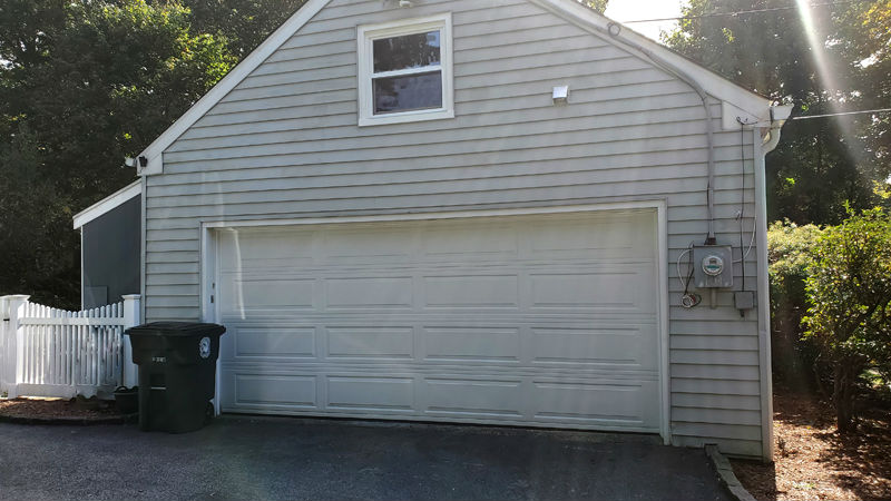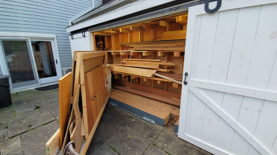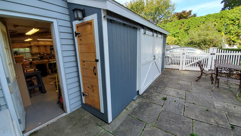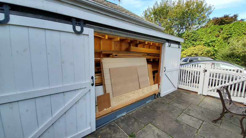 freestanding woodshed at the side of the garage. It has large sliding doors to get up to 14' boards and