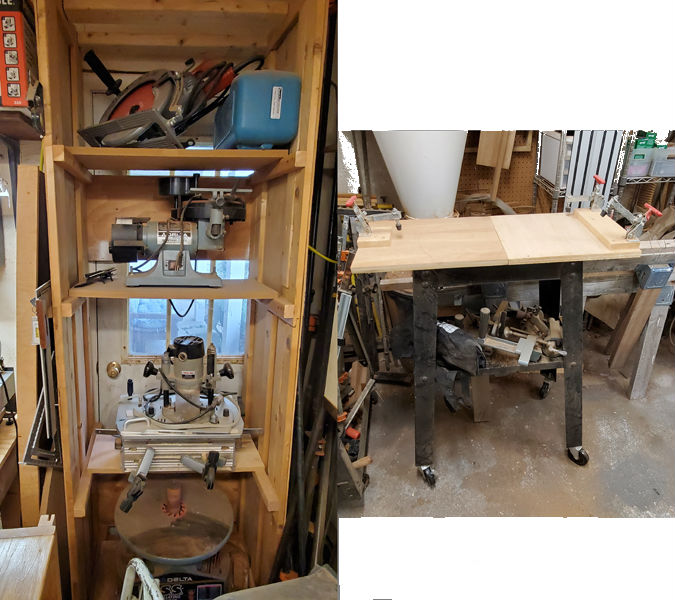 To maximize space, I created a rolling tower of small tools, each mounted onto its own board, that are sized to clamp onto a rolling stand. This gives me a lot of flexibility in a small space.