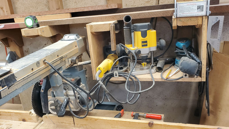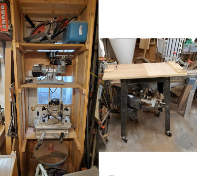 both the Radial and the Chop saw. Then, I added a flip up platform for the Mortiser to allow it to share the