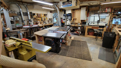 I've packed a lot into the space. I have a full compliment of tools, including a 52" SawStop Tablesaw, Powermatic 8" Jointer and 15" Planer, Delta Radial Arm Saw, Mortiser, Floor Standing Laser Drill Press, 18-36 Drum Sander, Jess-um Router Table, 6' bench, Shapeoko XXL CNC Router, Oneida
