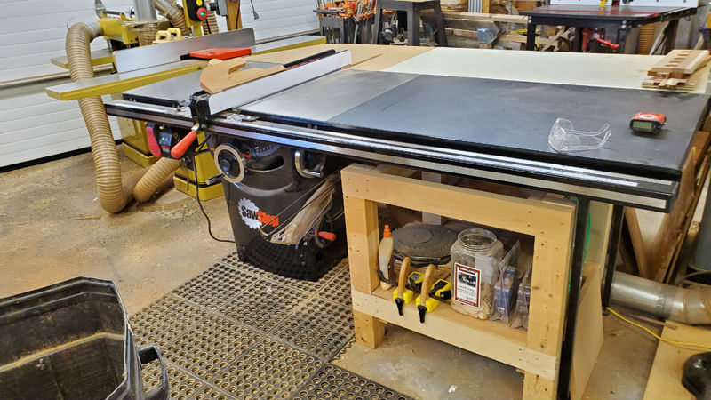 The heart of the shop is the SawStop Tablesaw. I built front and back shelving units around the saw to hold "stuff" and the back doubles as my outfeed table. I incorporated a Corian offcut into the outfeed table to give me a dead flat surface to use for assembly and glue doesn't stick to it.