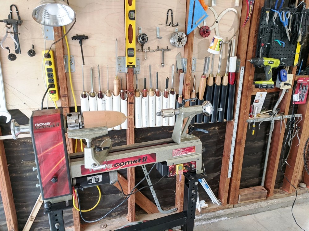 Figure 4 - Turning side of garage with lathe, chisels, lighting, calipers, chucks, etc.