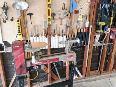 My solution was a convertible shop with a midi lathe on wheels, fold down workbench, between-the-studs racks for gouges, portable lighting and fans. It takes me about five minutes to convert the car garage to an operational woodshop and when finished for the day, about 20 minutes to fold, roll and