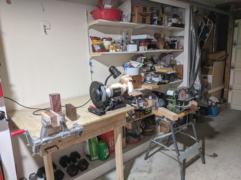 Woodturners are an adaptable lot. As an example, when a woodturner (me) buys a highly regulated 55+ California condo near his "West Coast" daughter's family he still figures out a way to convert the 12' x 21' single-car garage (that MUST be used to park a car) into a daytime woodturning shop.