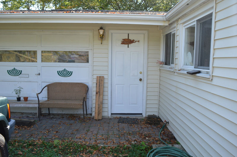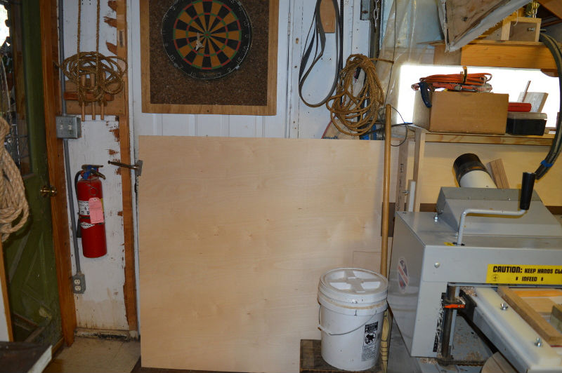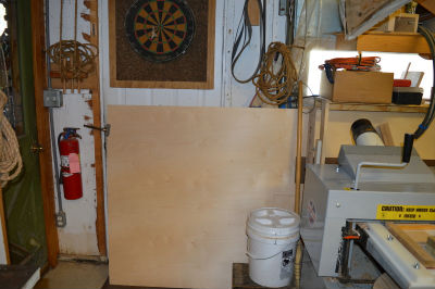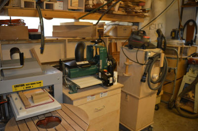 The garage door has been deactivated since I use that wall space for storage. Yes, there has never been a car in the 'garage'. I would like to replace the 30" entry door with a 40" door. In front of the disabled garage door are two big shelves suspended from the ceiling with chains. Chains are convenient for adjusting the shelves vertically. Below the suspended shelves is a wooden rack for storing plywood and works in progress. A Belsaw Multi-planer is the workhorse in my shop.