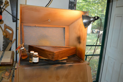 The spray booth sits on a storage cabinet with exhaust through the south wall. I use an airbrush to finish anything that fits in the booth. A turntable is super handy. The booth folds flat against the wall when I'm milling long stock on the drill press.