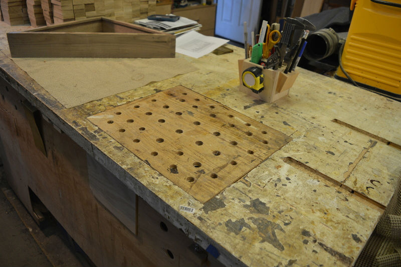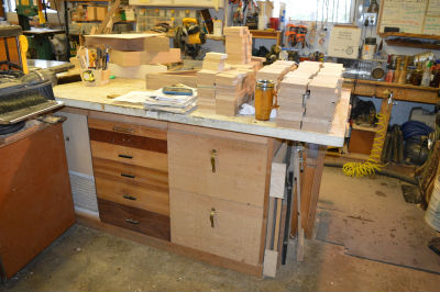 The backside of the workbench (all made from scrap) has multiple drawers on full-extension slides. The left end has a downdraft table. The top is a giant heavy door salvaged from a remodel of the home of a famous soccer coach.
