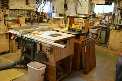 The table saw and planer are nestled next to the workbench. I can use the table saw to stack stock to feed the planer. Notice the square tube of the table saw fence. I unbolted this tube and shifted it to the right to increase my cutting width on the saw. A router hangs in the extension table on the saw with a cabinet below for bits, wrenches, etc.