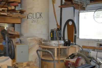 A shop-made dust collector is built around a $40 auction find. The super large filter bag maximizes airflow through the blower and 30-gallon paper drum dropbox with a Thein baffle.