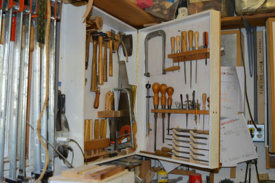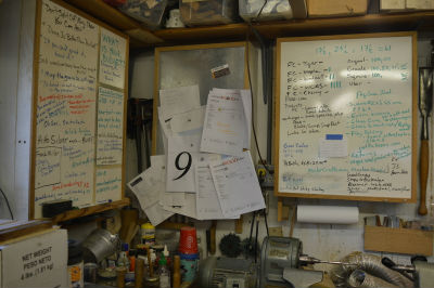 Next to the work center are several wall mounted tool cabinets with my most often used tools. Two cabinets have dry-erase board fronts for notes, shopping lists, etc. The third has a sheet of tin where I pin my orders with rare earth magnets.