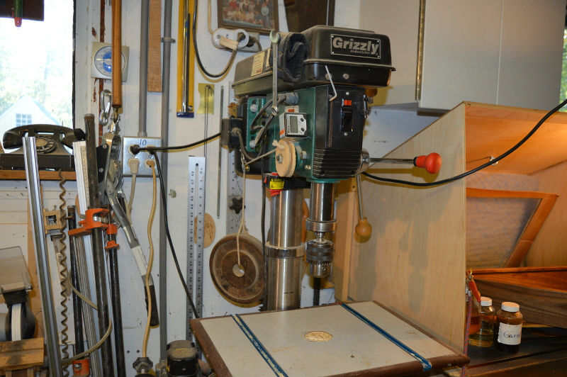 The drill press sits beside the lathe. Notice the 10lb plate hanging from the drill press. The retraction spring broke and while I waited for the replacement I rigged this weighted counter-balance. It doesn't automatically retract the quill, but rather keeps the quill suspended when I remove my hand from the handle.